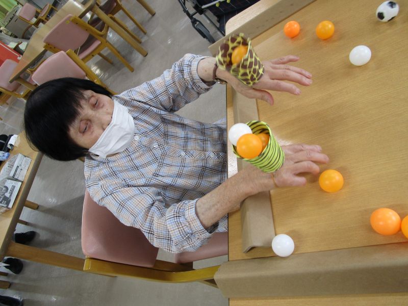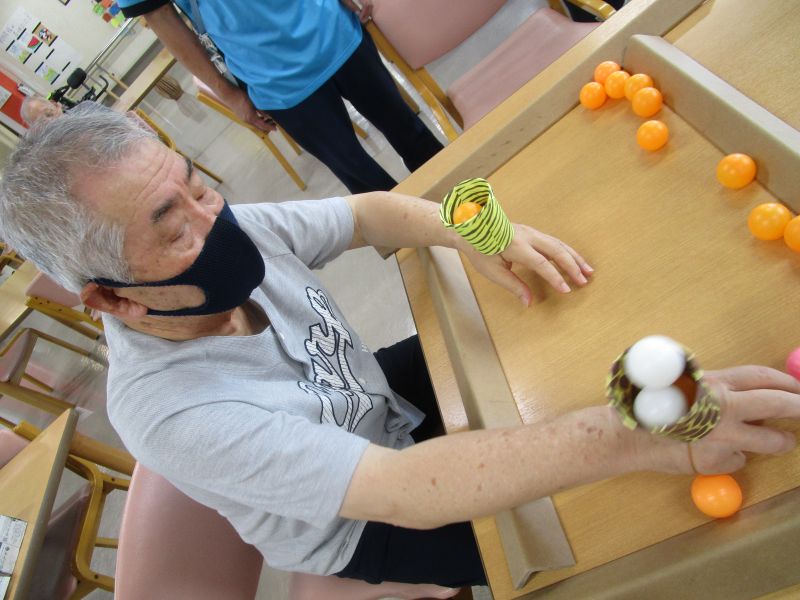 2つ目は両手首につけたカゴにピンポン玉を入れるゲーム!