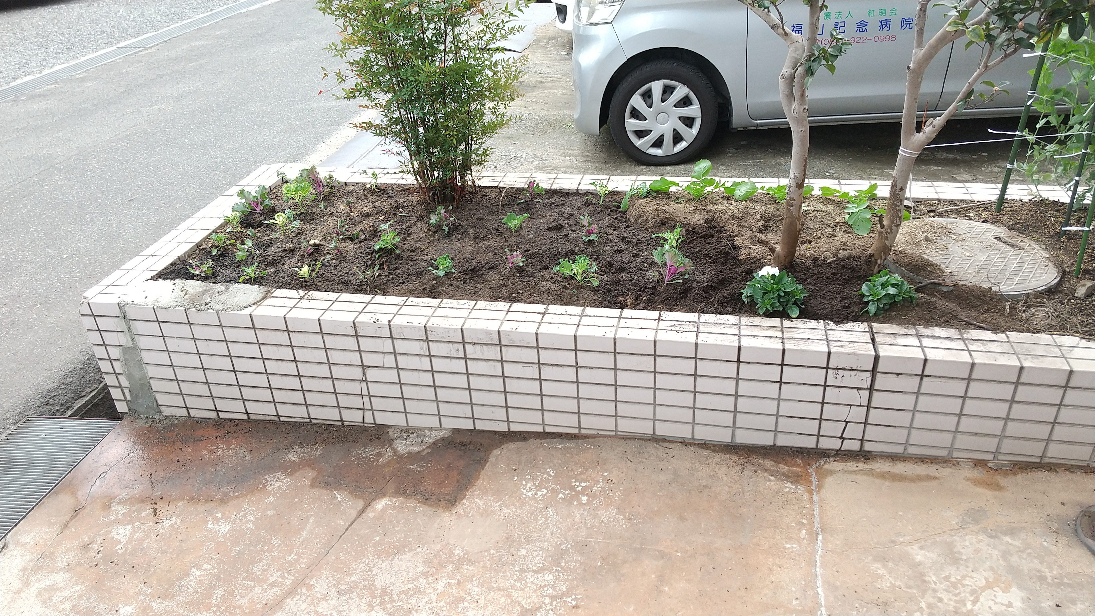 表の花壇のツバキを取って、葉ボタンとパンジーを