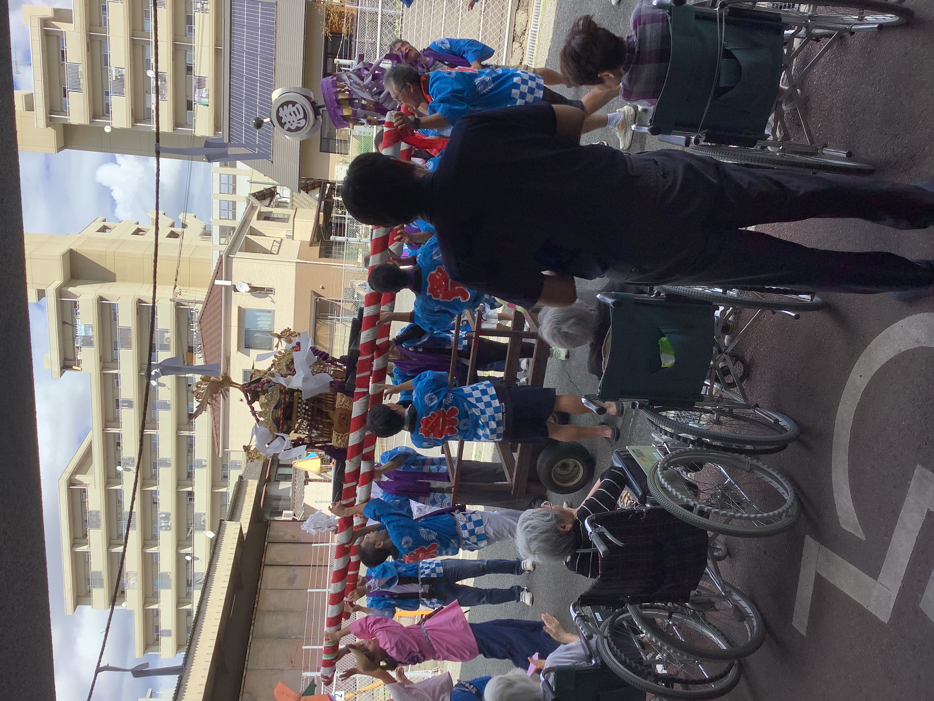 本日、地域の伝統行事「子供神輿」が当施設にやってきました!色鮮やかな法被を着た子どもたちが、元気いっぱいの掛け声とともに神輿を担ぎ、施設の玄関前に到着。ご利用者様は窓辺や玄関で手を振りながら、「かわいいね」「元気をもらったよ」と笑顔で声をかけていました。